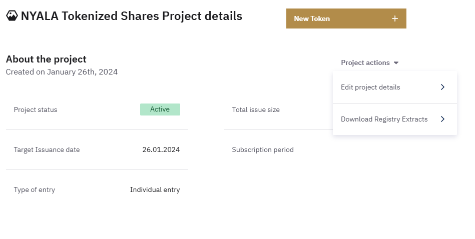 To manually download a set of registry extracts for investors in a given token, log into the NYALA Web Portal and navigate to the "Project details" screen, and in the project actions drop-down menu select the option "Download Registry Extracts".